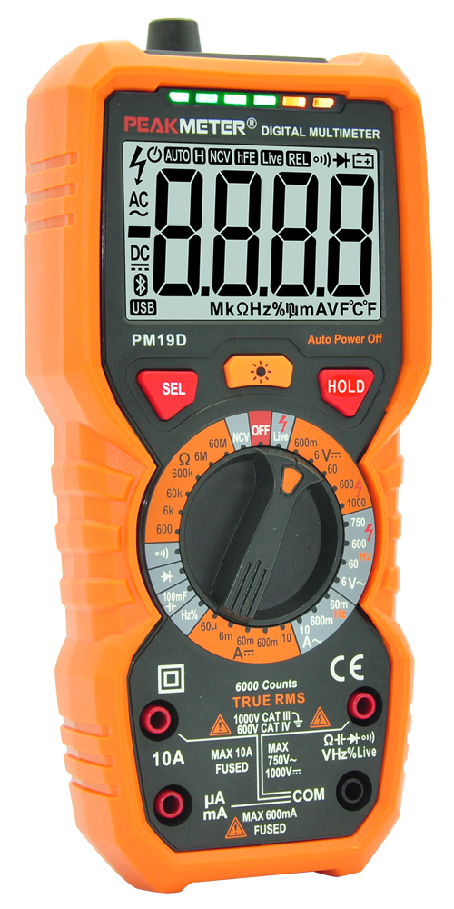 PeakMeter PM19D – это портативный многофункциональный цифровой мультиметр с функцией измерения среднеквадратического значения True RMS, оснащенный большим ЖК-дисплеем с задней подсветкой для удобства считывания показания, и фонарем. PeakMeter PM19D имеет функцию защиты от перегрузки и индикацию разряженной батареи.